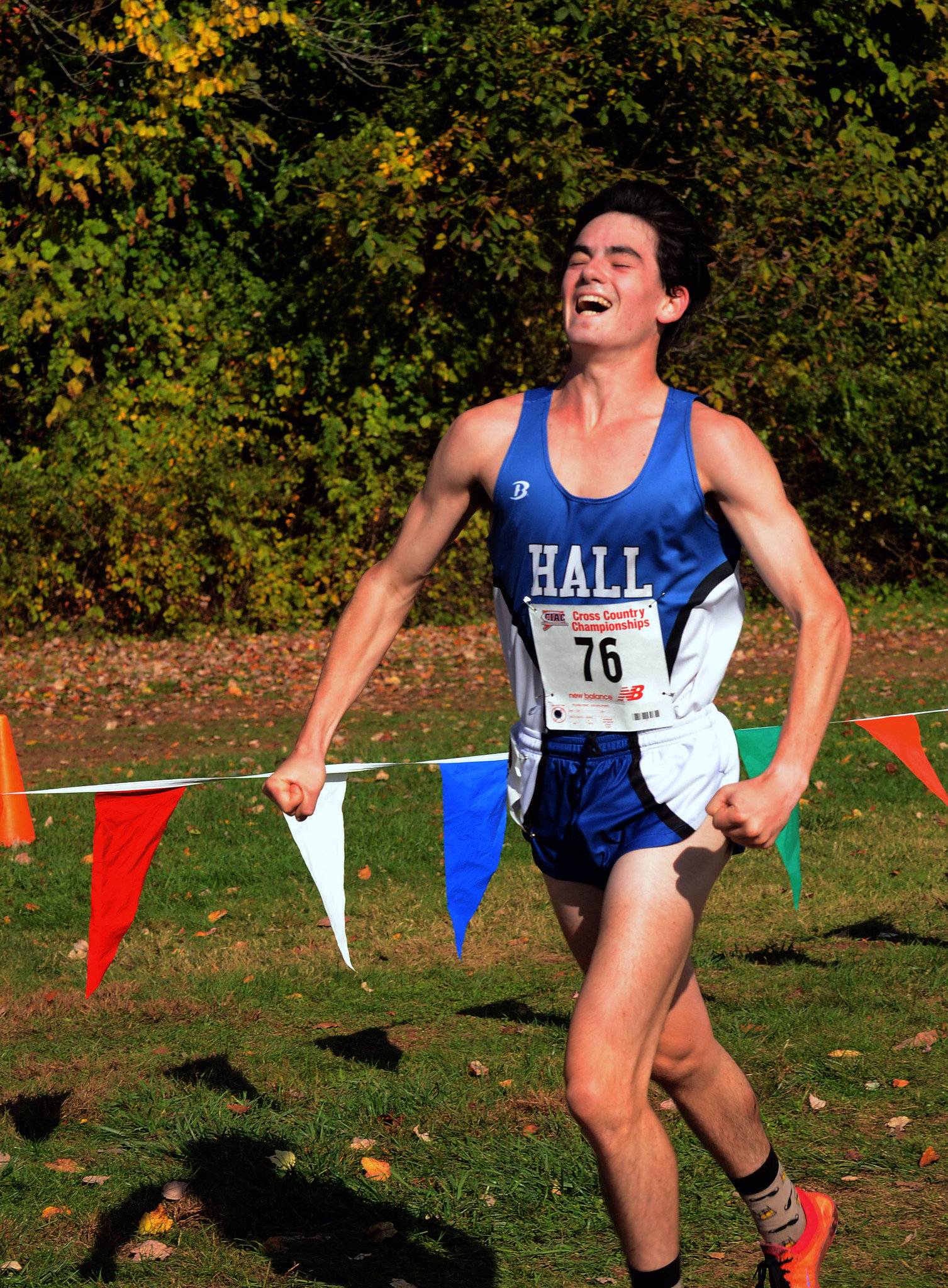 MANCHESTER 10-25-2014 Hall High Ari Klau celebrates as he approaches the finish lane during a CIAC Class boys and girls cross country championships Saturday afternoon at Wickham Park in Manchester Ari won first place (Marc-Yves Regis I, special to the Courant)